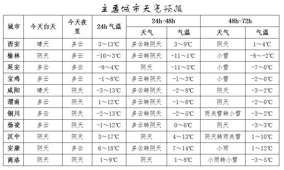 24日:全省阴天,陕北部分地方有小雪,关中、陕南小雪或小雨。