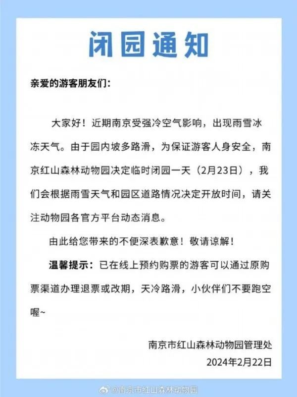 受冰雪天气影响,园区路面结冰,道路湿滑,为确保广大游客的生命财产安全,我园明日(2月23日)临时闭园一天,进行道路清理,2月24日恢复开放。已经网上预约和购票的游客,可通过原购票渠道申请退款。由此给您带来的不便,敬请谅解!
