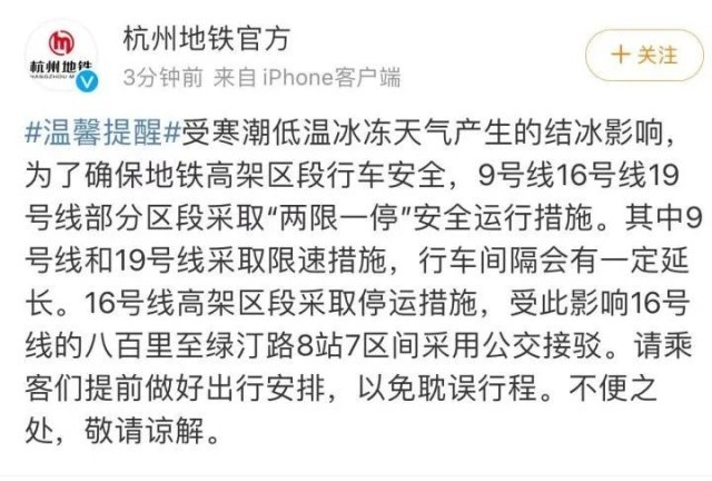 受寒潮低温冰冻天气产生的结冰影响,今天早晨,@杭州地铁官方 发布通告:为了确保地铁高架区段行车安全,9号线16号线19号线部分区段采取“两限一停”安全运行措施。其中9号线和19号线采取限速措施,行车间隔会有一定延长。16号线高架区段采取停运措施,受此影响16号线的八百里至绿汀路8站7区间采用公交接驳。