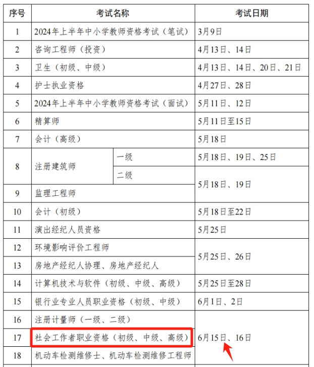 2024年社会工作者考试时间定在6月15-16日。截图如下: