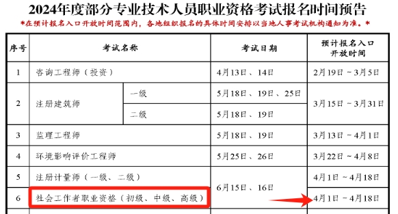 2024年度部分专业技术人员职业资格考试报名时间预告中明确了2024年社会工作者报名时间范围,报名入口开通时间为4月1日-4月18日。截图如下:
