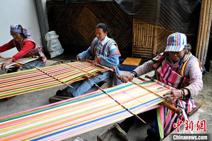 3月,迪政当村民丁秀珍(中)与其他独龙族妇女一起织独龙毯。 中新社记者 李嘉娴 摄