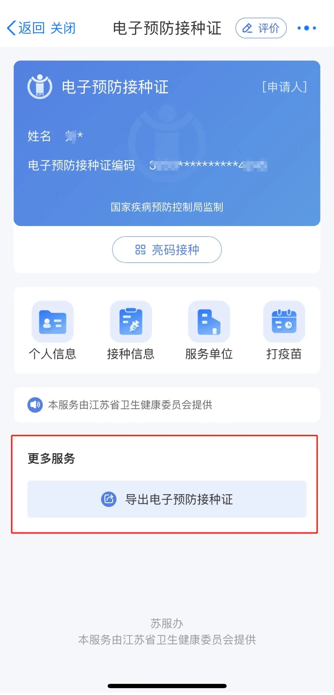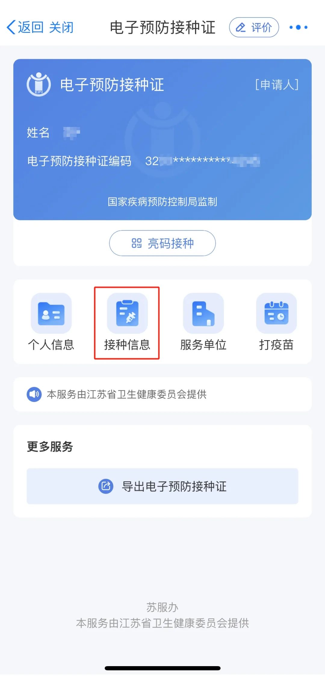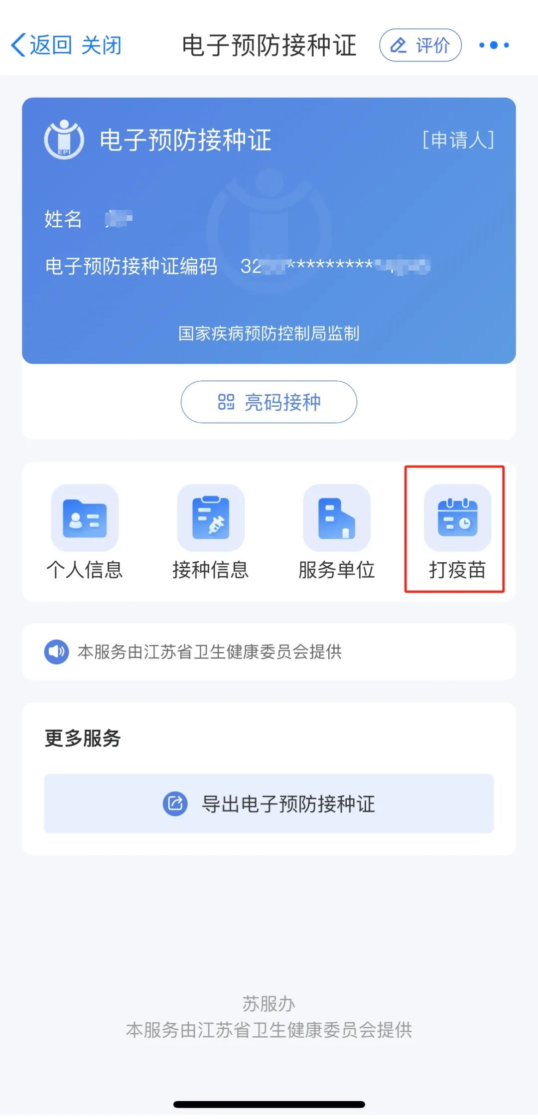 在支付宝首页搜索“苏服办”,进入小程序,在首页搜索“电子预防接种证”,进入服务。
