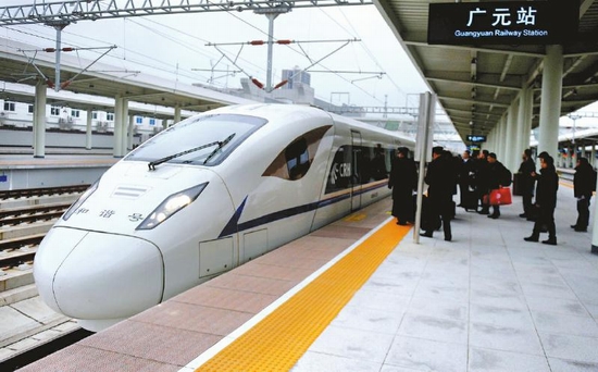 从西安出发的高速列车行驶在广元千佛崖佛像的对岸。这是西成高铁开通后首个春运,每天,50多对动车飞驰在这条铁路大通道上,平均每小时3对车,几乎趟趟满员。出行变得更为方便快捷,人流、物流集聚,外出打工的人,谋划着回家乡做事 三六九、往外走。