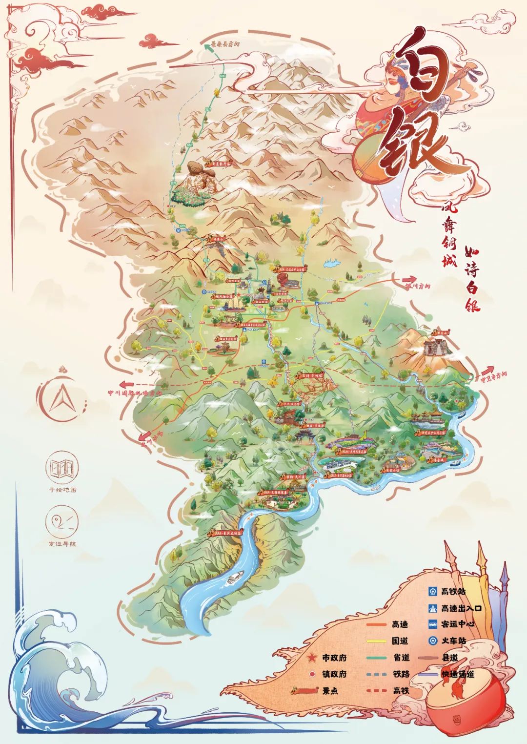 “白银城区旅游手绘地图”以“凤舞铜城·如诗白银”为主题,详细介绍了白银城区的四个主题旅游线路:白银工业文明游、主题公园欢乐游、乡韵乡愁休闲游、黄河风情体验游四个主题旅游线路,展示了20余个旅游景点,以及白银美食、精品酒店、非遗民俗、当地特产等旅游相关信息。