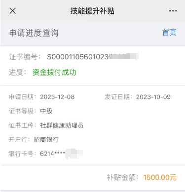 考取社群健康助理员四级证书可领取1500元补贴,三级可领取2000元补贴,二级可领取2500元补贴。
