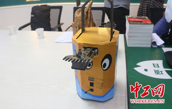 周红亮和团队研制的小黄人“线路除障精灵”。中工网记者 朱晶晶 摄