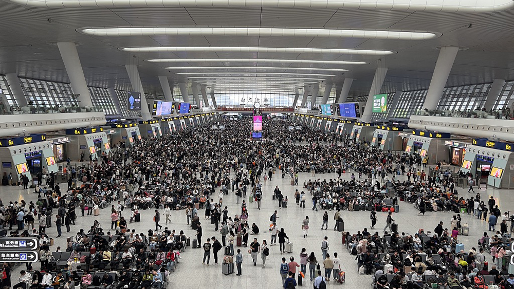 2024年5月2日,铁路杭州东站候车大厅人山人海。视觉中国 图