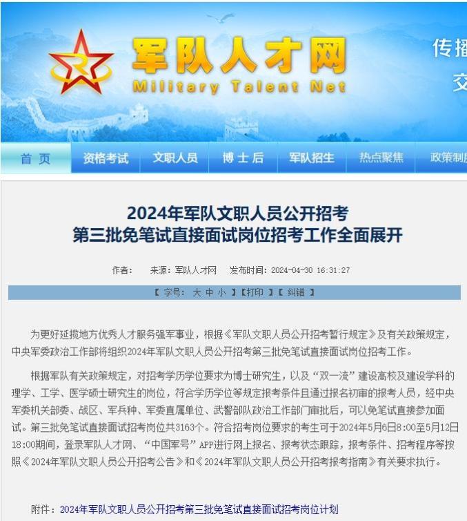 为更好延揽地方优秀人才服务强军事业,根据《军队文职人员公开招考暂行规定》及有关政策规定,中央军委政治工作部将组织2024年军队文职人员公开招考第三批免笔试直接面试岗位招考工作。