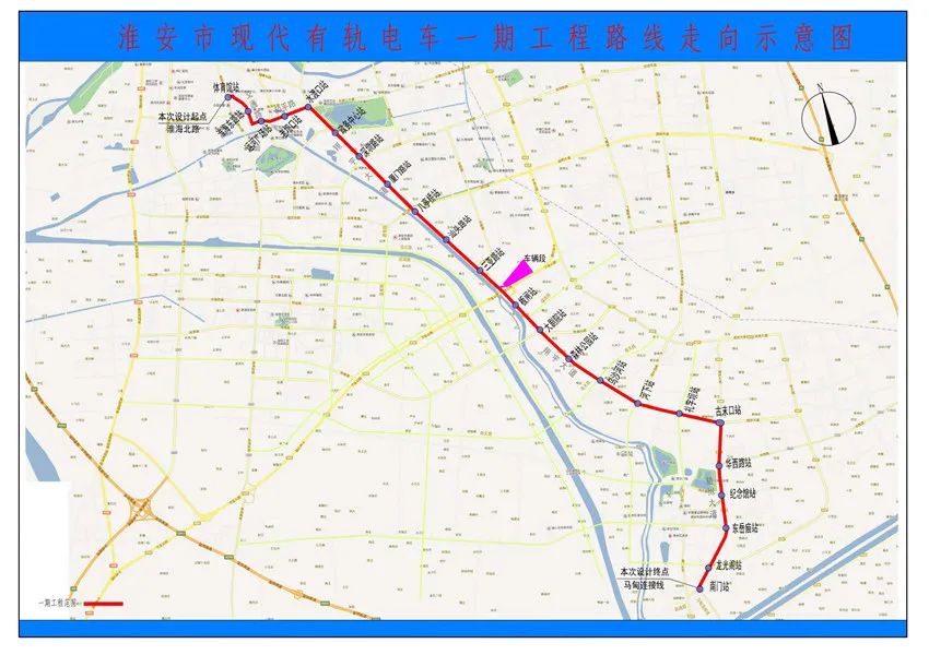 淮安有轨电车二号线:规划中线路,西起有轨电车1号线古末口站,东至淮安东站,全长7.5公里。