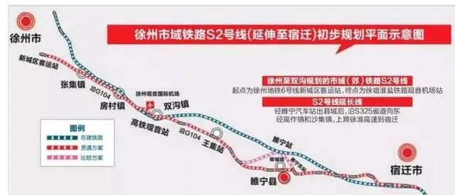 并且为了进一步贯通与宿迁交通网,S2号线延长线经睢宁汽车东站出睢宁县城后,拟沿325省道向东,途径高作、沙集两镇,上跨徐淮高速公路到宿迁市境内。
