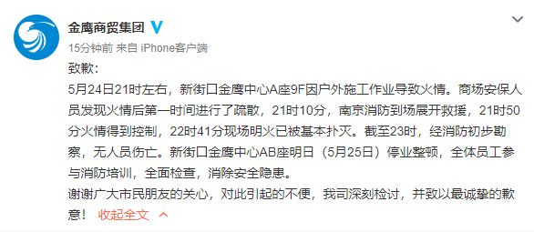 南京新街口金鹰失火:无人员伤亡 金鹰商贸集团发布致歉信