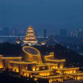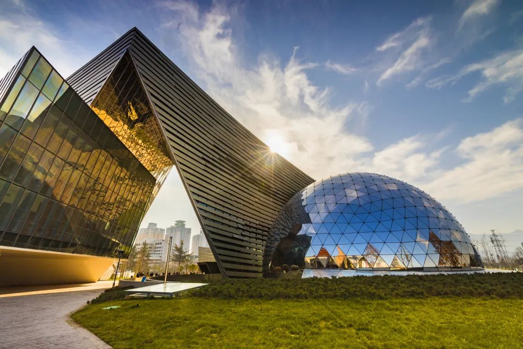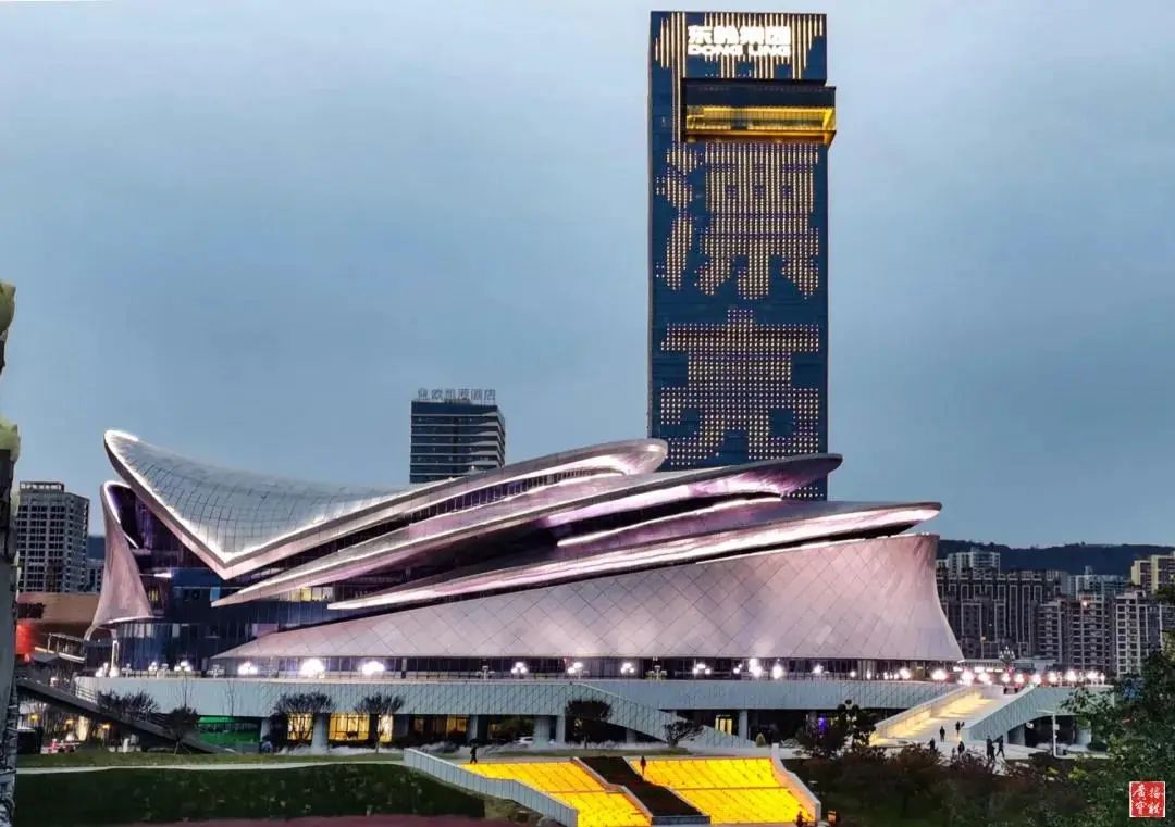这座美丽恢弘的建筑就是宝鸡的核心地标式建筑之一——宝鸡大剧院。设计凸显了宝鸡精神中"闻鸡起舞、开放创新"的元素,将凤凰作为建筑的主要灵感来源之一,从空中鸟瞰宝鸡大剧院,其屋顶流线像是三片凤凰羽翼,随河边的清风漂浮在城市之中。