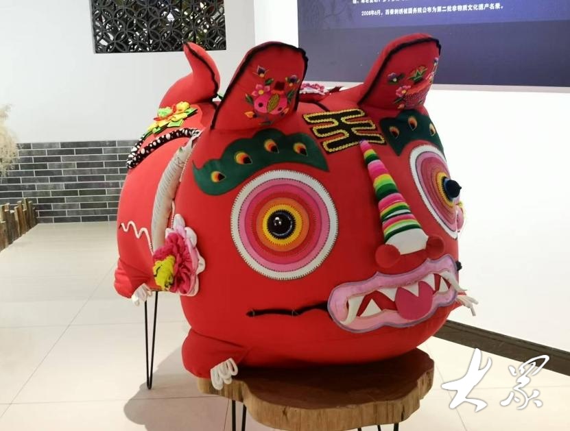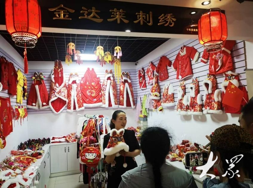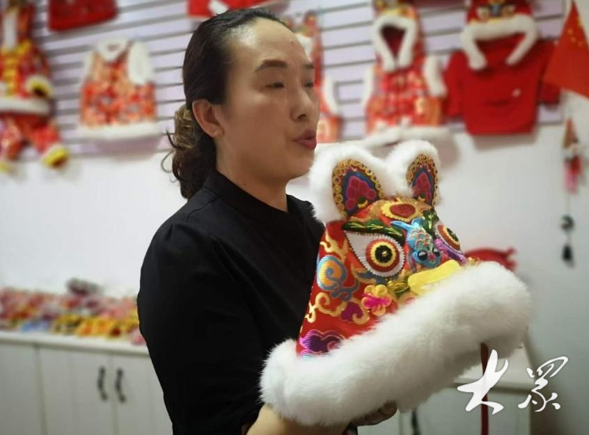 一进产业园销售展示间,映入记者眼帘的,是琳琅满目、造型各异的虎头鞋、虎头帽以及各种花鸟鱼虫图案的刺绣,一个巨大的老虎造型的刺绣前,引来不少人驻足拍照。