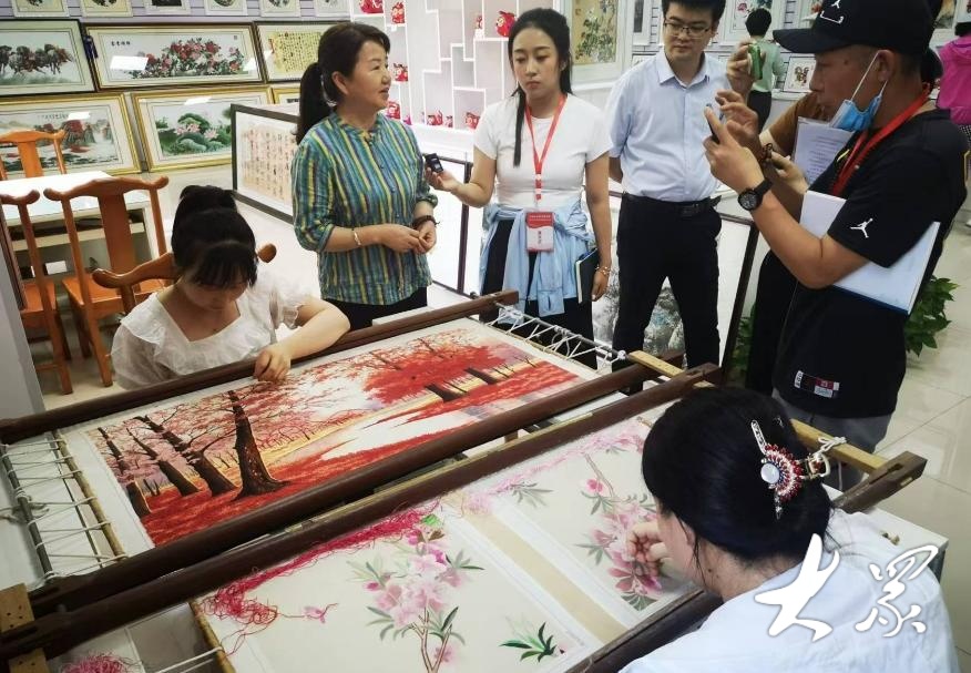 在另一家工坊,调研团实地采访刺绣过程,两位年轻的绣娘正在进行刺绣。
