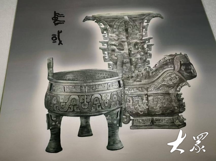绣有“中国”字样的青铜器造型刺绣,色彩、光泽与实物几乎一样,如果不是用手摸,肉眼很难看出是刺绣。