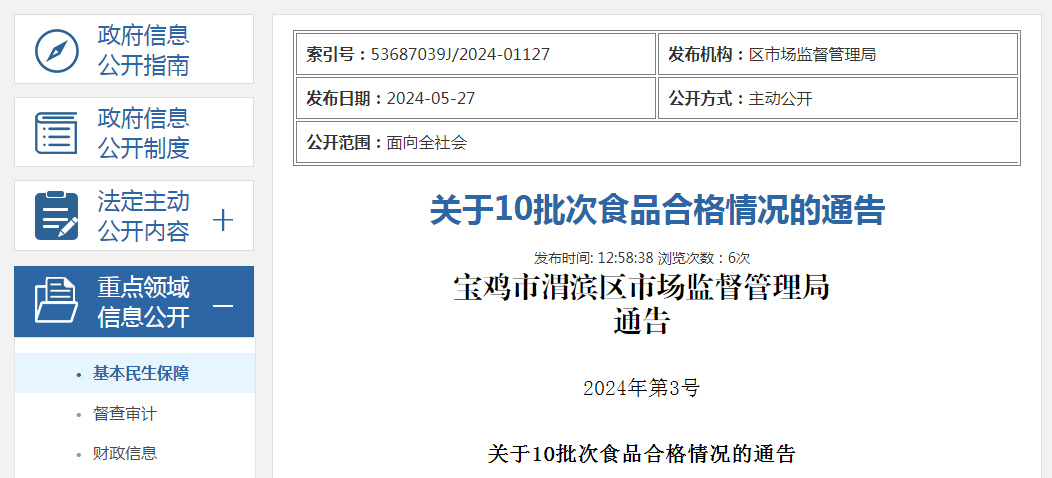 陕西省宝鸡市渭滨区市场监督管理局关于10批次食品合格情况的通告(2024年第3号)