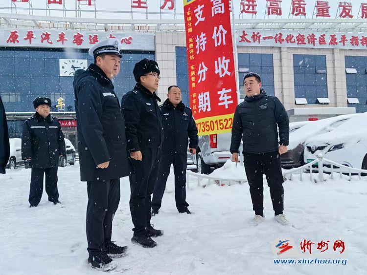 忻州网讯 近日,山西省多地普降中雪,省公安厅交管局副局长褚万里、事故处邢海龙在忻州市公安局交警支队支队长刘元丰、副支队长武俊德、事故科科长高志勇的陪同下在原平市督导检查恶劣天气道路交通安全管理工作。