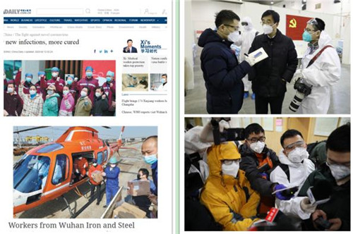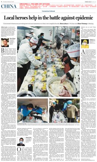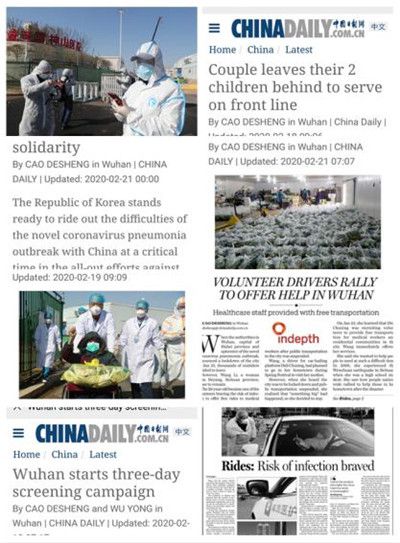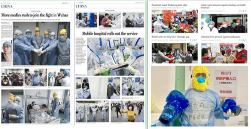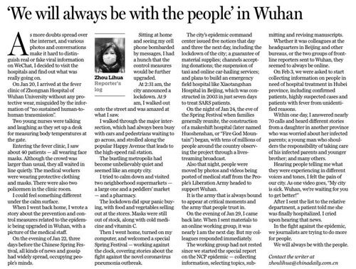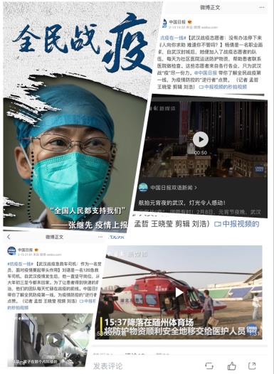 “连日来,中国日报前线记者昼夜忙碌,不敢稍有松懈。按照中央指导组宣传组的要求,我们把一线抗疫英雄、城市市民英雄、援鄂情、社区防控、火神山雷神山建设、方舱医院等等作为各个阶段的报道重点,不断加大报道量,向海内外传播中国人民众志成城抗击疫情的行动和决心。”