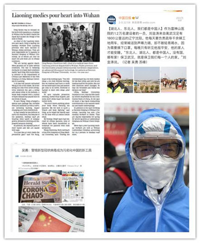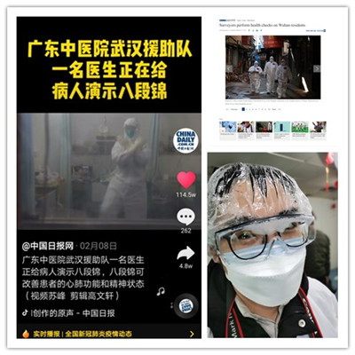 中国日报辽宁记者站副站长吴勇在疫情发生后,多次主动报名请战。2月4日到达武汉后,基本每天都在外奔波,采访了多支援鄂医疗队、火神山雷神山医院、志愿者、多个在汉外籍人士,尤其是多次采访中医治疗的方舱医院,同时接受波黑媒体的采访,借助外媒讲述武汉的真实情况。图示:吴勇本人及其所做报道截图。