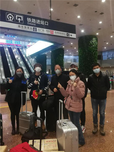 2月14日,中国日报第三批赴武汉记者从北京西站出发。从左至右:李馨、王韦翰、(潘忠明送行)、雷蕾、曹德胜、王敬。