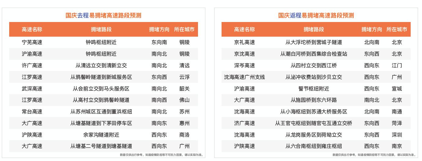 哪些路段易堵?报告显示,去程易拥堵高速路段有宁芜高速、沪渝高速、许广高速、江罗高速、武深高速等;返程易拥堵高速路段有京礼高速、京沈高速、深岑高速、沈海高速广州支线、沪渝高速等。
