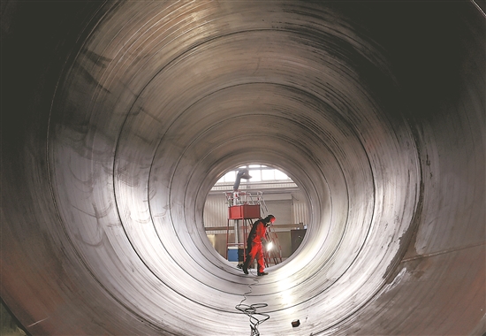 4月6日,宝鸡石油钢管有限责任公司输送管生产车间内,陕西省重点民生工程引汉济渭用超大口径钢管正在紧张生产中。据了解,这是集团公司目前为止生产的最大口径输送管,口径达到3448毫米。