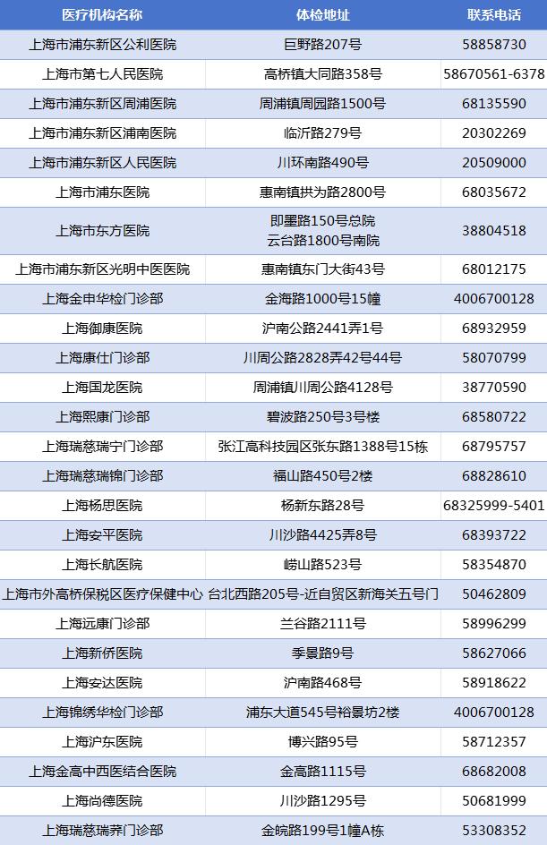登录上海市从业人员预防性健康检查信息查询网站(https://jkz.sh.cn/index.html),选择“体检机构查询”一栏,查询上海市各区进行健康证的体检机构。目前,浦东新区可以进行健康证的体检机构有27家(见下表)。