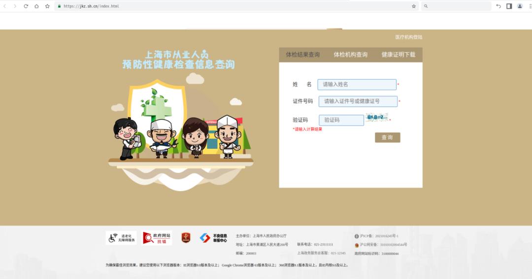 在进行预防性健康检查一周左右,可以登录上海市从业人员预防性健康检查信息查询网站(https://jkz.sh.cn/index.html),选择“体检结果查询”一栏,输入健康检查者的姓名和身份证号码及验证码,进行查询。