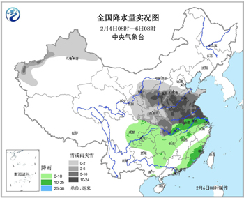 6日08时至7日08时,新疆西南部、西藏西部、内蒙古中西部偏南地区、西北地区东部、华北大部、黄淮、江汉、江淮、江南西北部等地有小到中雪或雨夹雪,其中,河南中南部、安徽北部、江苏中部偏西地区、湖北北部等地有大雪,部分地区有暴雪(10~16毫米)。西南地区中东部、江南、华南北部等地有小到中雨(见图2)。