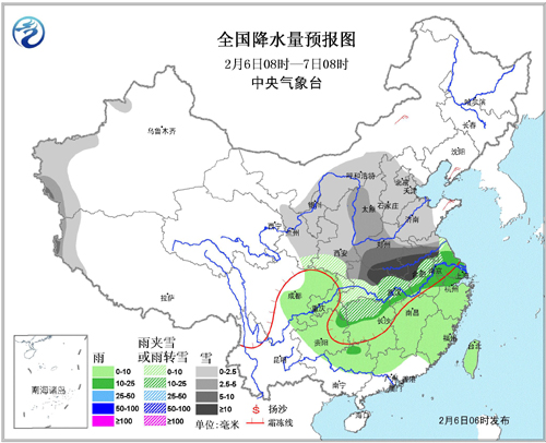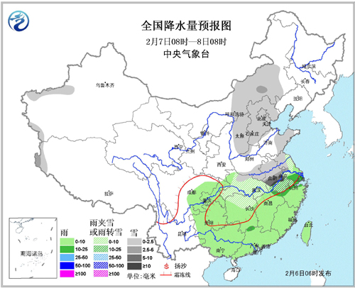 图2 降水量预报图(2月6日08时至7日08时)