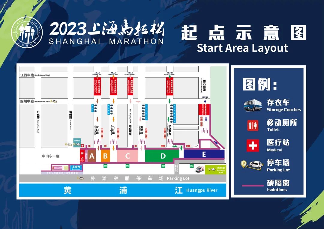 本次赛事A、B、C、D、E区运动员分别从汉口路、九江路、滇池路、中山东一路、南苏州路进入集结区。除E区不提供健康跑跑者存衣服务,其他各区均就近设置若干存衣车。