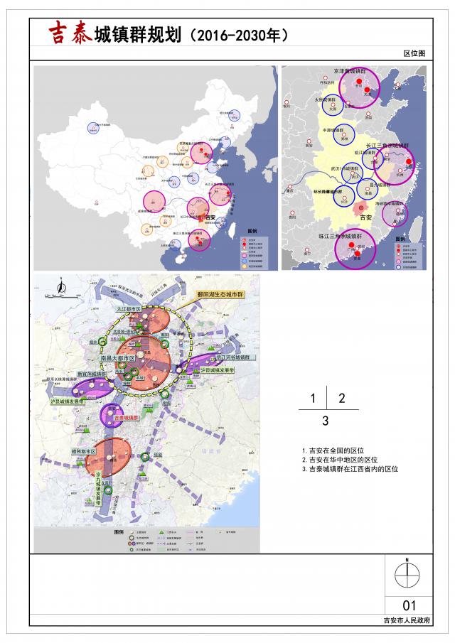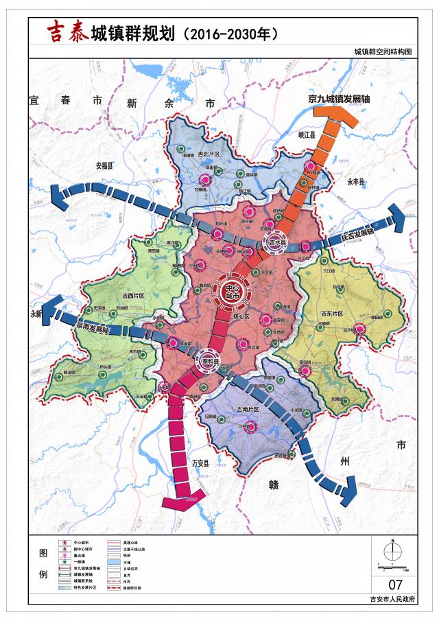吉泰城镇群:包括吉州区、青原区以及吉安县、吉水县、泰和县两区三县的全部行政辖区,总面积为8658平方公里;主要解决发展重点与空间管控的问题。