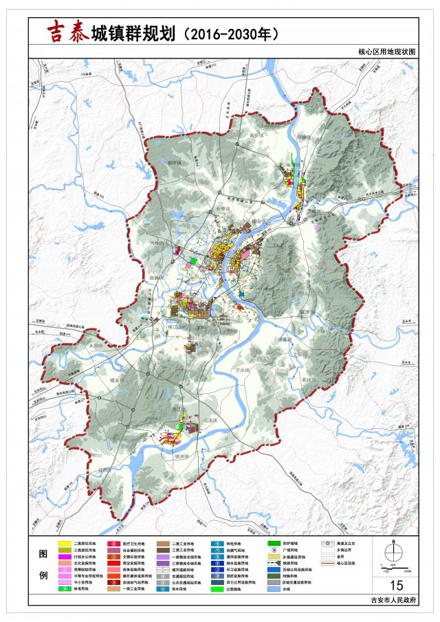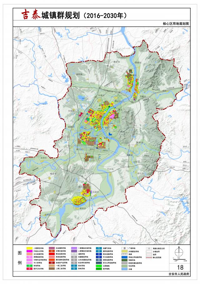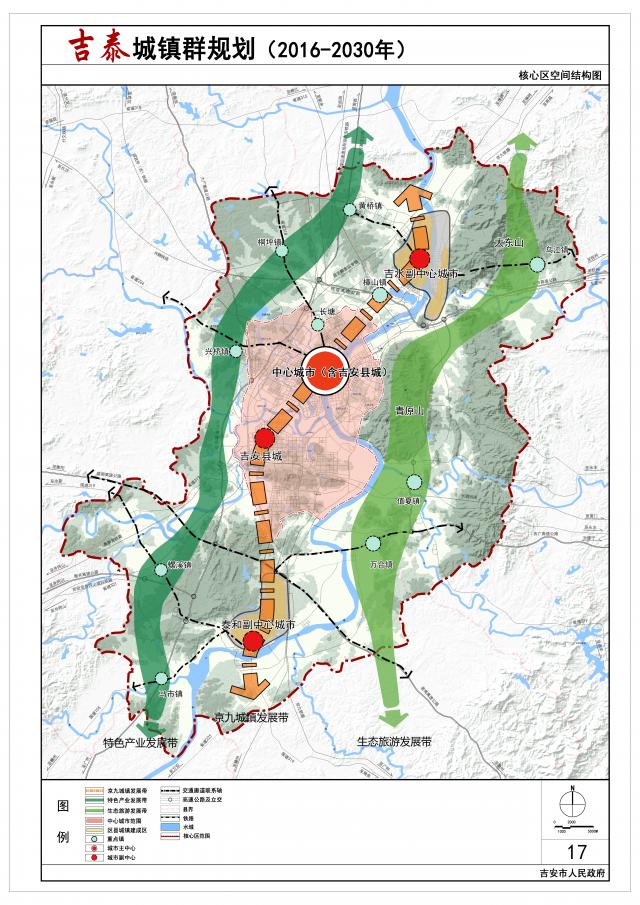 吉泰城镇群核心区(以下简称核心区):包括吉州区的古南街道、永叔街道、文山街道、习溪桥街道、北门街道、白塘街道、兴桥镇、樟山镇、长塘镇、曲濑镇、禾埠乡,青原区的河东街道、滨江街道、天玉镇、值夏镇、新圩镇、富滩镇、文陂镇,吉安县的高新街道、敦厚镇、永阳镇、横江镇、永和镇、桐坪镇、凤凰镇,吉水县的文峰镇、金滩镇、黄桥镇、醪桥镇、乌江镇,泰和县的澄江镇、塘洲镇、马市镇、螺溪镇、万合镇、沿溪镇、石山乡、南溪乡,共9个街道、29个乡镇,总面积约为2940平方公里;主要解决城乡一体化发展的问题。