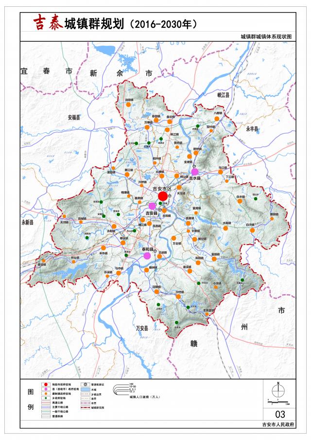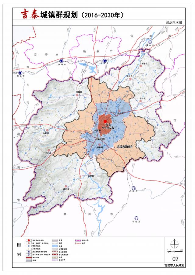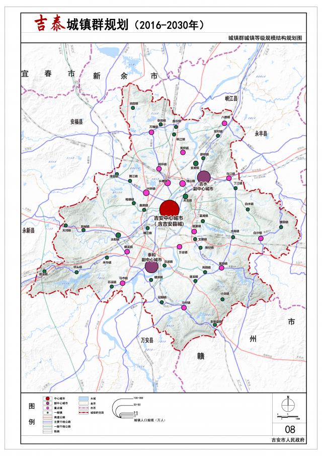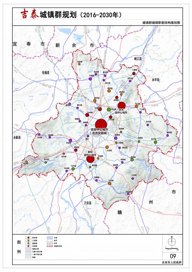 规划形成“中心城市-副中心城市-重点镇-一般镇”四级城镇等级体系,其中中心城市1个,为吉安中心城市,副中心城市2个,为吉水县城和泰和县城,重点镇15个,一般建制镇34个。