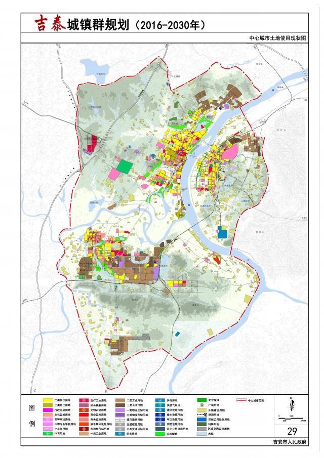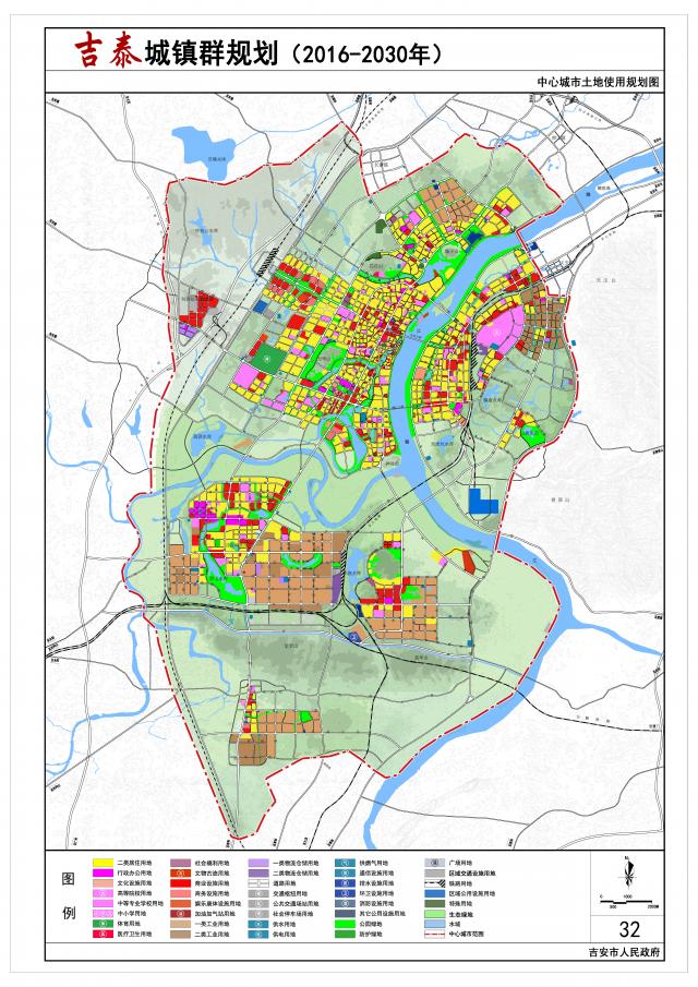 中心城市:南起凤凰行政边界,北至西四乡公路-吉安北大道-樟山镇文石河,东起赣江-东外环线,西至昌吉赣高速铁路-大广高速公路,总面积约416.1平方公里;主要解决中心城市空间布局的问题。