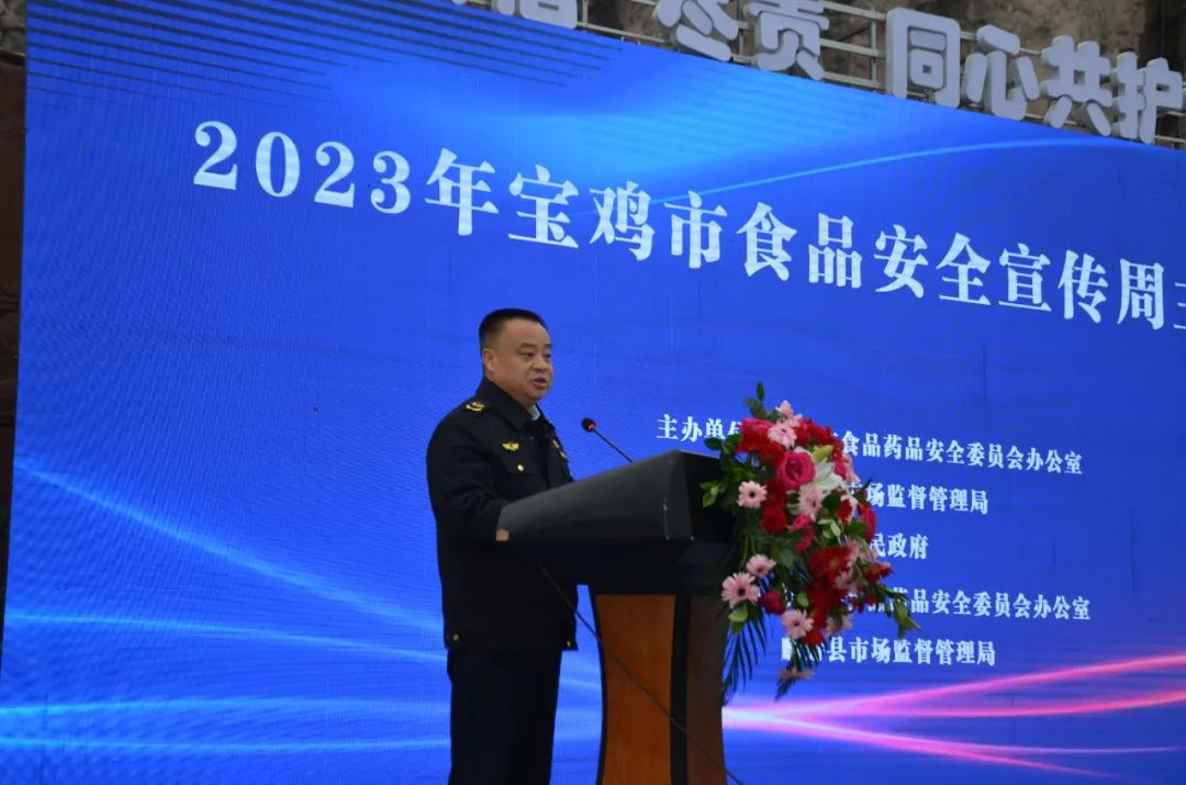 11月30日上午,宝鸡市在麟游县青莲山广场举行2023年食品安全宣传周启动仪式,市政府副秘书长翟建平,市食药安办主任、市市场监管局局长卢剑平,麟游县委副书记魏莉、副县长朱鹏飞,市食药安委相关成员单位负责同志参加启动仪式。各县区食药安办负责同志,包保干部代表、食品从业人员代表、食品监管执法人员、市级新闻媒体等参加活动。