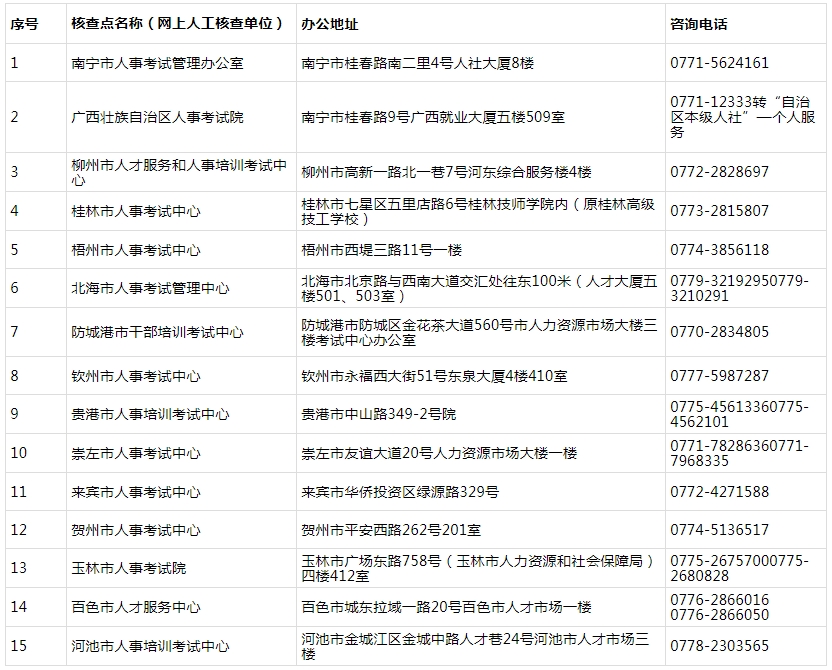 全区人事考试组织机构(核查点)地址及联系方式如下: