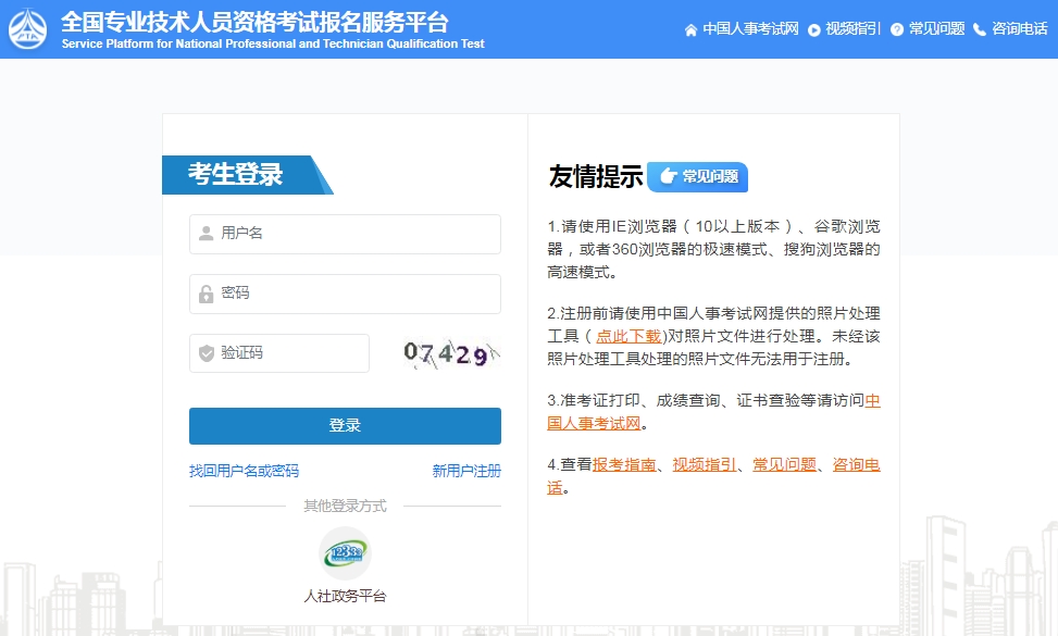 1. 注册。首次报考人员按要求填写、提交注册信息。注册成功后,登录报名系统上传本人电子证件照(照片处理工具及使用说明可登录中国人事考试网【】下载)。报考人员按照系统提示进行信息完善,报名系统对报考人员身份、学历学位等注册信息进行在线核查(核查结果在提交信息后24小时内反馈,建议报考人员提前完成注册),“账号信息完整度”为100%时才可进入考试报名。