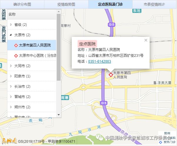 定点医院及门诊模块以天地图为地图,利用天地图服务提供的精准的地理位置信息,将山西省卫健委公布的定点医院和发热门诊在地图上精确定位。系统对定点医院和发热门诊分别按照级别以树形列表进行展示,全图时可以看到所有定点医院和发热门诊的分布情况,显示全省范围的定点医疗机构和发热门诊,以不同颜色的图标表示,如图7所示。点击定点医院或发热门诊按钮时,地图上单独显示该类,点选列表上任一医院名称,可在地图上展示其详细信息,同时在地图上点击医院图标可以查看详细信息,如名称、地址、电话等,还可以快速拨打电话进行咨询,显示定点医院列表和详情,如图8所示。该模块以精准的位置服务和详细的医疗资源,为民众提供医疗地理信息服务,以便民众在必要时以最快速度找到的最近的医疗机构。
