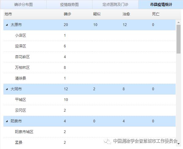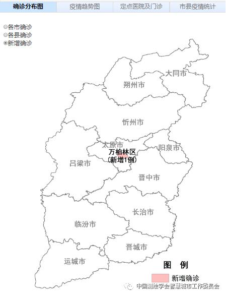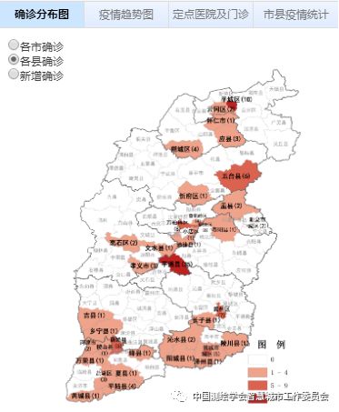 疫情分布地图将山西省各市确诊病例、各县确诊病例及各县新增病例人数在地图上利用分级设色的方式进行渲染,直观地展现了确认病例的分布情况。