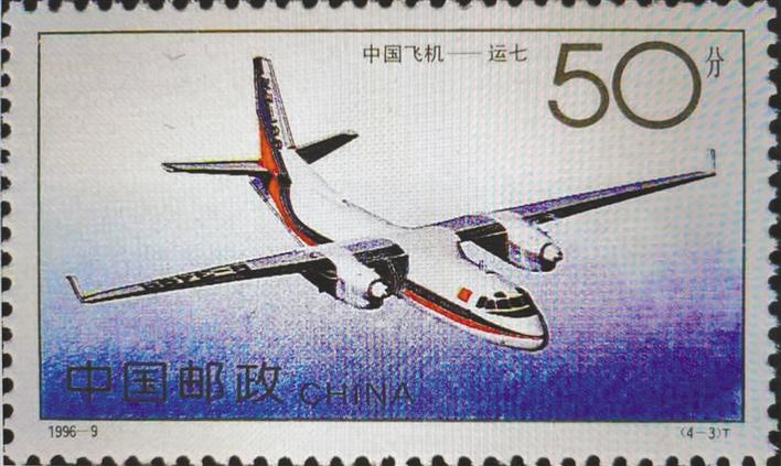 《中国飞机》特种邮票上的“运七”飞机图案。(摄于8月10日)