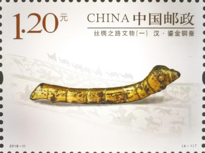 2018年5月19日发行的《丝绸之路文物(一)》特种邮票之《汉·鎏金铜蚕》。 (摄于8月10日)