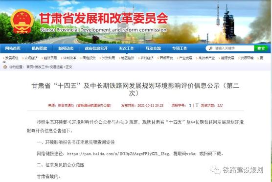 铁路建设规划消息:10月11日,《甘肃省“十四五”及中长期铁路网发展规划环境影响评价信息公示(第二次)》在甘肃省发改委网站发布。《公示》主要内容如下。