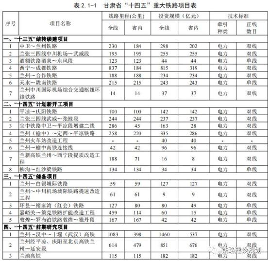 综合考虑服务国家重大战略、构建国家路网通道、支撑区域经济高质量发展、人民群众便捷高效出行需求、地方政府财力等因素,“十四五”规划铁路20项,建设总里程2438公里(含扩能改造)。其中,到“十四五”末建成中兰铁路、兰州~张掖三四线、酒额铁路酒泉~东风段、兰州中川国际机场综合交通枢纽环线铁路、平凉~庆阳铁路、宝中铁路中卫~平凉段增建二线等项目,新增铁路运营里程1035公里,其中高铁里程765公里,复线率、电气化率分别达到68.9%、90%。