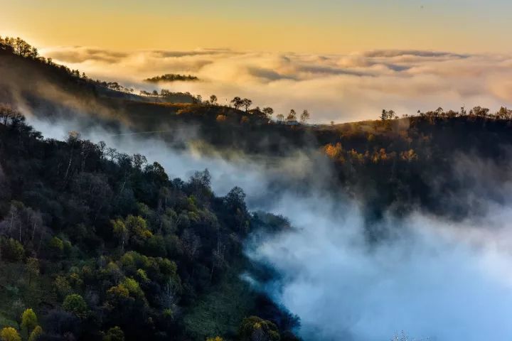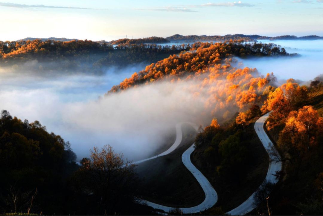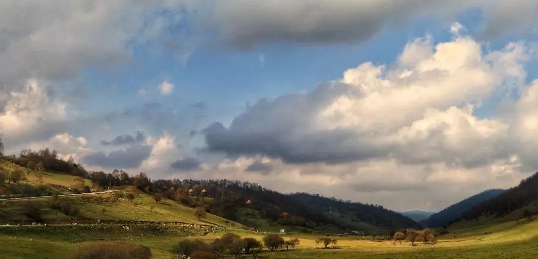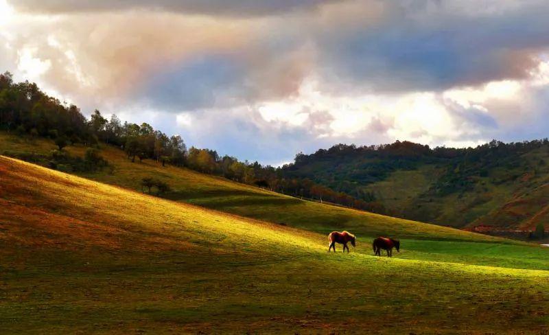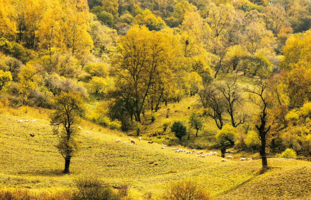 行走在御马川蜿蜒的观光环线上可尽览关山草原柔美的曲线。谷坡相连,草场辽阔。秋风吹过,一地金黄。在或明或暗光线的加持下,呈现出不同的色彩。