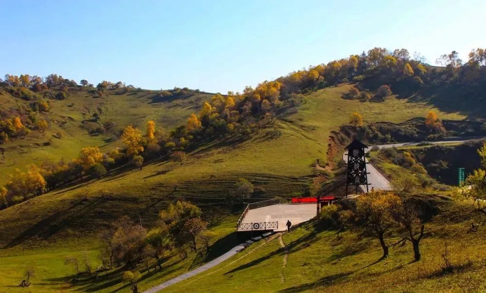 鞍子沟因谷地酷似马鞍而得名。沟谷开阔,两旁山坡平缓。从沟底自山坡上,草的颜色逐渐变深。自鞍子沟前行,还可一览假日酒店和房车营地的秋色。