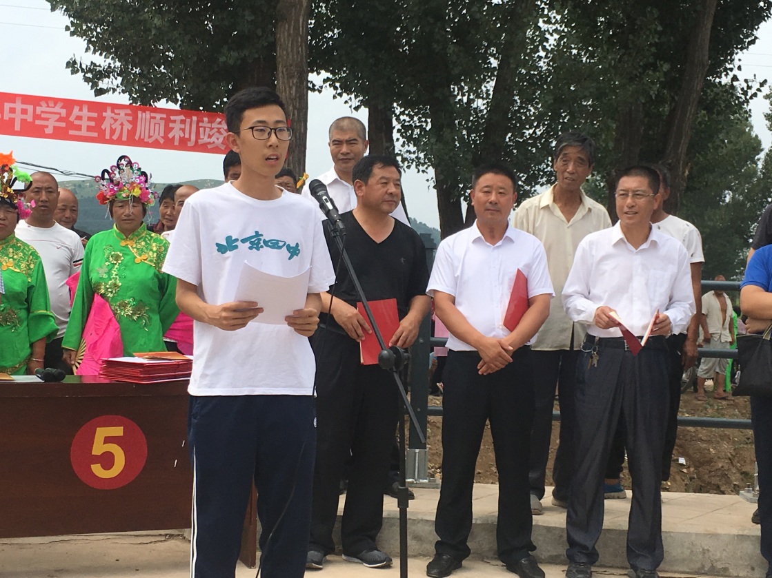 竣工仪式上,北京茅以升科技教育基金会理事长茅玉麟说到,“该小桥是全国第一座由中学生筹资建设的公益小桥,2017年10月茅以升公益桥中学生桥社的第一任社长张欣源同学找到我,想成立一个桥社,发动全国中学生通过义演、义卖等活动筹资建设一座茅以升公益桥。”茅玉麟强调,筹建一座小桥涉及筹资、选址、勘察、设计和施工等各个环节,困难非常大。2018年1月5日,孩子们邀请北京爱乐合唱团在北京师范大学附属实验中学组织了一场400多人的公益演出,当天筹集善款达一万六千多元。“今天咱们的中学生桥终于建成通车了,我对孩子们的爱心和组织能力刮目相看,谢谢孩子们。”