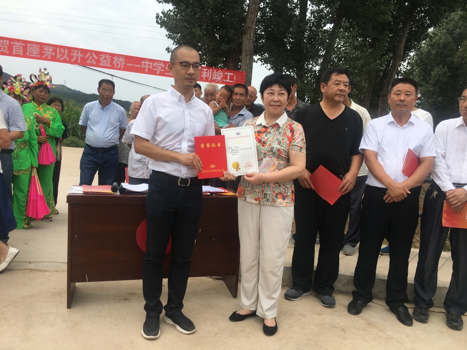 竣工仪式上,茅玉麟为在本次活动中成绩显著的社员,颁发了卓越领导、顽强拼搏和突出贡献奖,为小桥建设做出突出贡献的单位颁发荣誉证书。仪式开始前,北京茅以升科技教育基金会理事长茅玉麟、陈德县交通局赵小兰副局长以及国铁集团工程管理中心盛黎明副主任等领导还专程来到小桥附近的六沟镇初级中学看望正在支教的茅以升中学生社团的孩子们,鼓励他们共同建立持久的手拉手、心连心的友谊之桥,并主持了中铁铁五院集团公司为学校捐赠图书、投影仪的捐赠仪式。