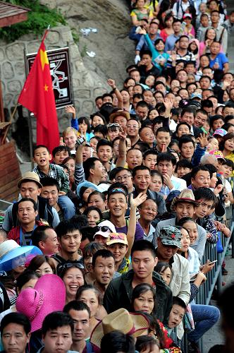 游客在西岳华山风景区有序地排队等待乘坐北峰索道(10月3日摄)。新华社记者 陶明 摄